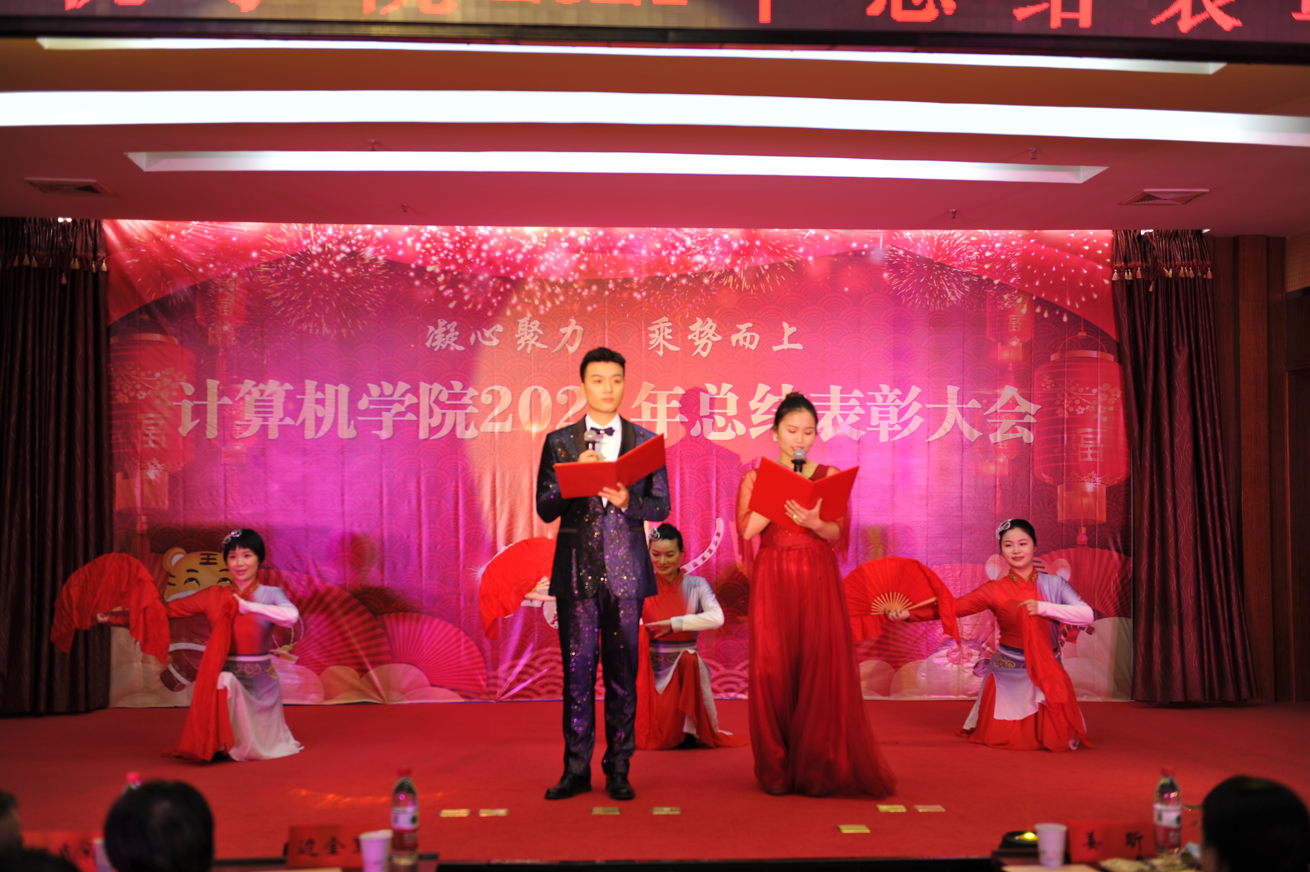 表彰大会结合了往年年终总结会传统元素,颁奖期间还穿插了五个精彩节目的表演与两轮幸运大抽奖。学院办公室工会小组为建党百年华诞献上的伴舞诗朗诵《百年初心精神 沐浴党的光辉》,气势恢宏,振奋人心,舞姿曼妙,婀娜多姿,瑜伽俱乐部舞蹈《追光者》,动作标准,游刃有余,翩若惊鸿,婉若游龙,杜建伟老师歌曲《滚滚长江东逝水》声如洪钟、荡气回肠,研究生演唱《风吹麦浪》歌声婉转动听,天籁之音,曹建文老师歌曲《把一切献给党》真情实意,寓意深刻。两轮幸运大抽奖环节,将大会推向了高潮。