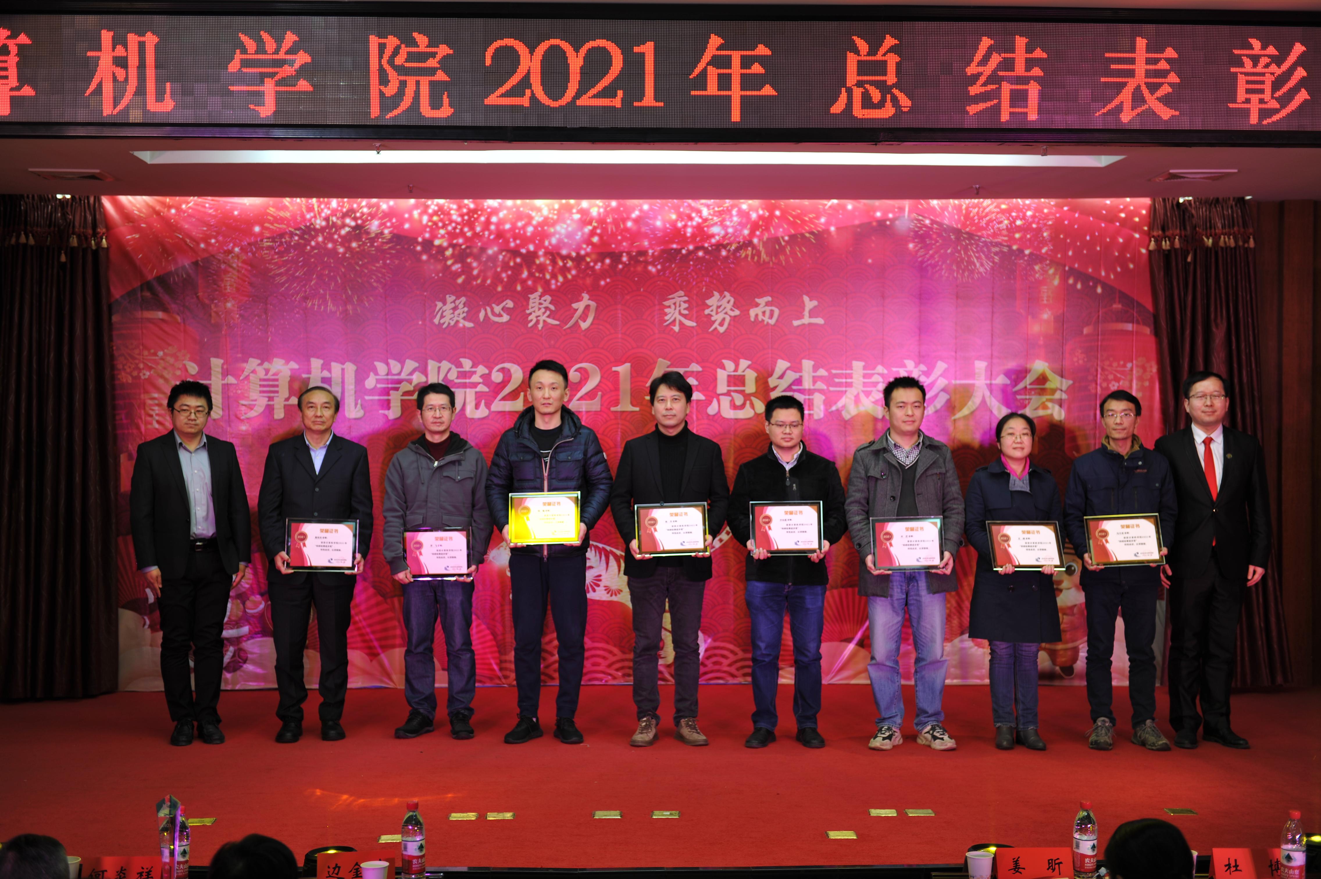 随后,表彰大会在喜庆的音乐和热烈的祝贺声中拉开序幕。大会表彰了在人才培养、科学研究、管理服务等工作中致力于学院发展的优秀教职员工99人,179人次。其中表彰奖项包括:师德标兵3人,特别贡献奖4人,杰出教学贡献院长奖10人,本科生优秀指导教师奖10人,优秀导师奖18人,留学生优秀任课教师4人,留学生研究生优秀指导教师4人,高水平论文奖16人,科研经费领先奖10人,科研经费进步奖10人,科研成果突破奖1人,科研项目突破奖1人,成果转化突破奖1人,人才称号获得者4人,省级以上奖项获得者1人,招才引智奖8人,工程教育认证工作奉献奖13人,特色化示范性软件学院申报工作奉献奖9人,学科评估工作奉献奖13人,工会活动奉献奖6人,实习实训奉献奖1人,网络改造奉献奖1人,优秀班级导师15人,优秀辅导员6人,优秀实验员2人,管理服务金牛奖8人。颁奖嘉宾分别为优秀个人逐一颁发荣誉证书并合影留念。