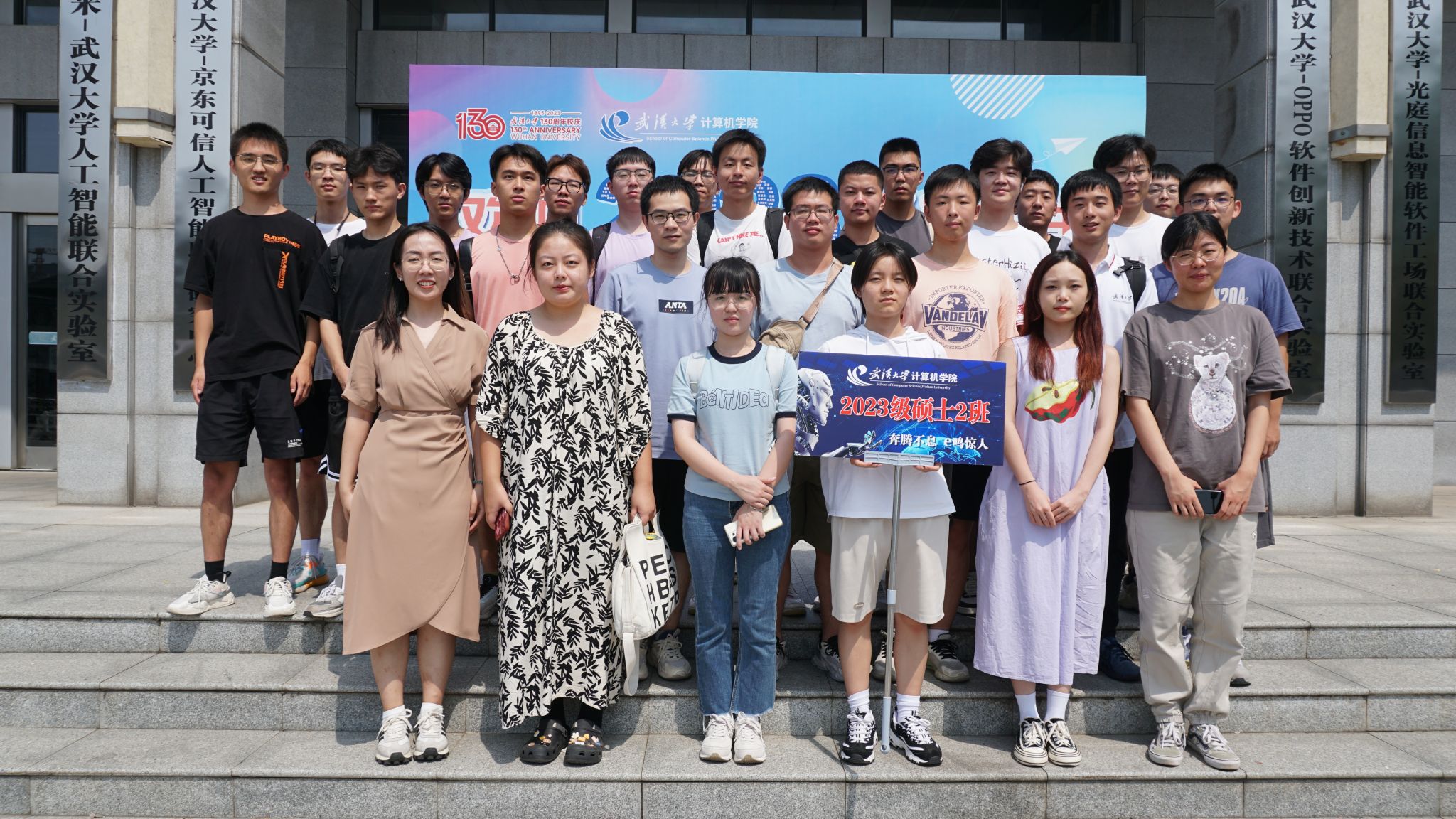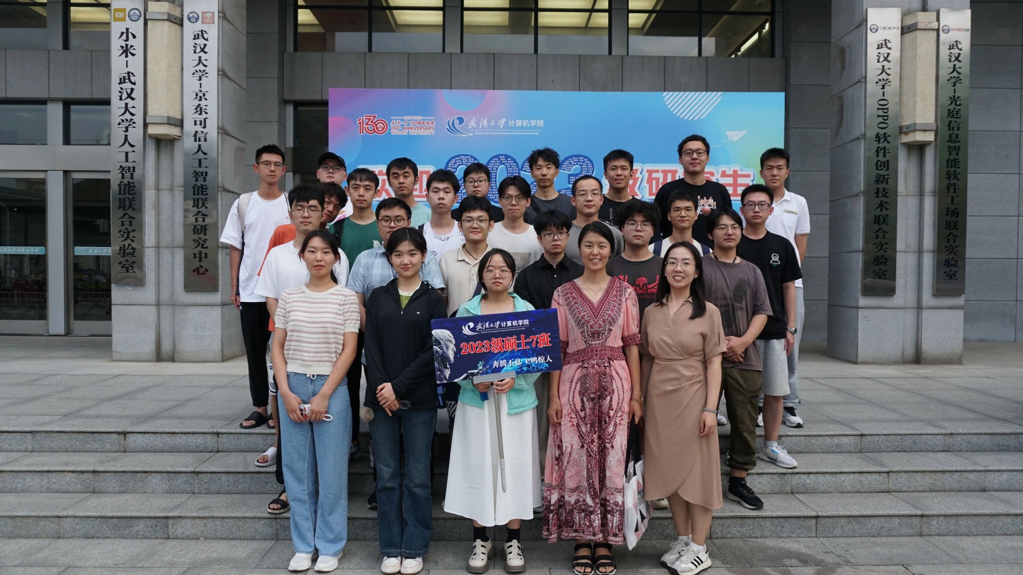 9月10日当天,研究生新生还以班级为单位,利用报告间隙与辅导员史然老师一起前往写有2023级全体研究生姓名的迎新喷绘前,拍摄了入学第一张班级合影,并召开了入学第一场新生班级见面会。